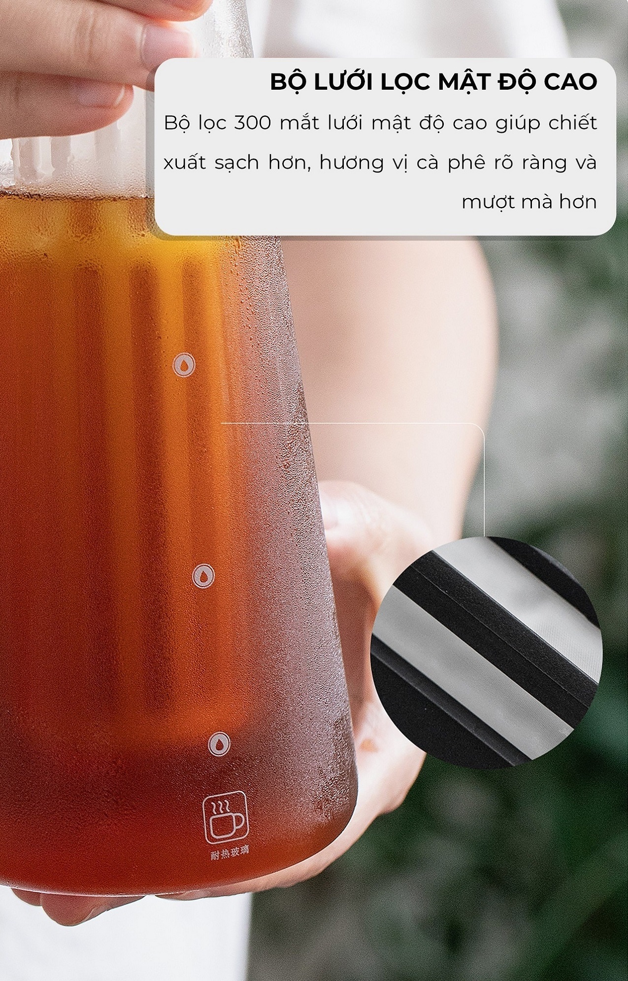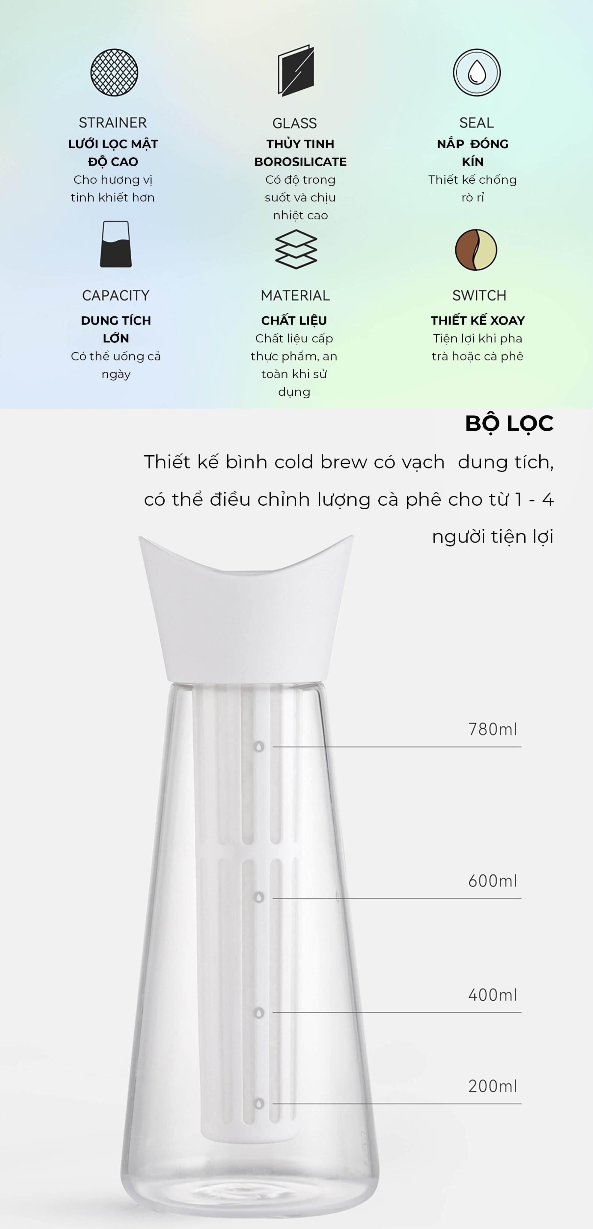 ✅ Bình pha cà phê lạnh dạng ngâm cà phê bột trong nước lạnh rất dễ sử dụng, trong khi đó lại cho hương vị cà phê phong phú hơn rất nhiều so với các phương pháp pha chế thông thường bằng nước nóng. Hơn nữa hạn chế được axit và vị đắng trong cà phê.