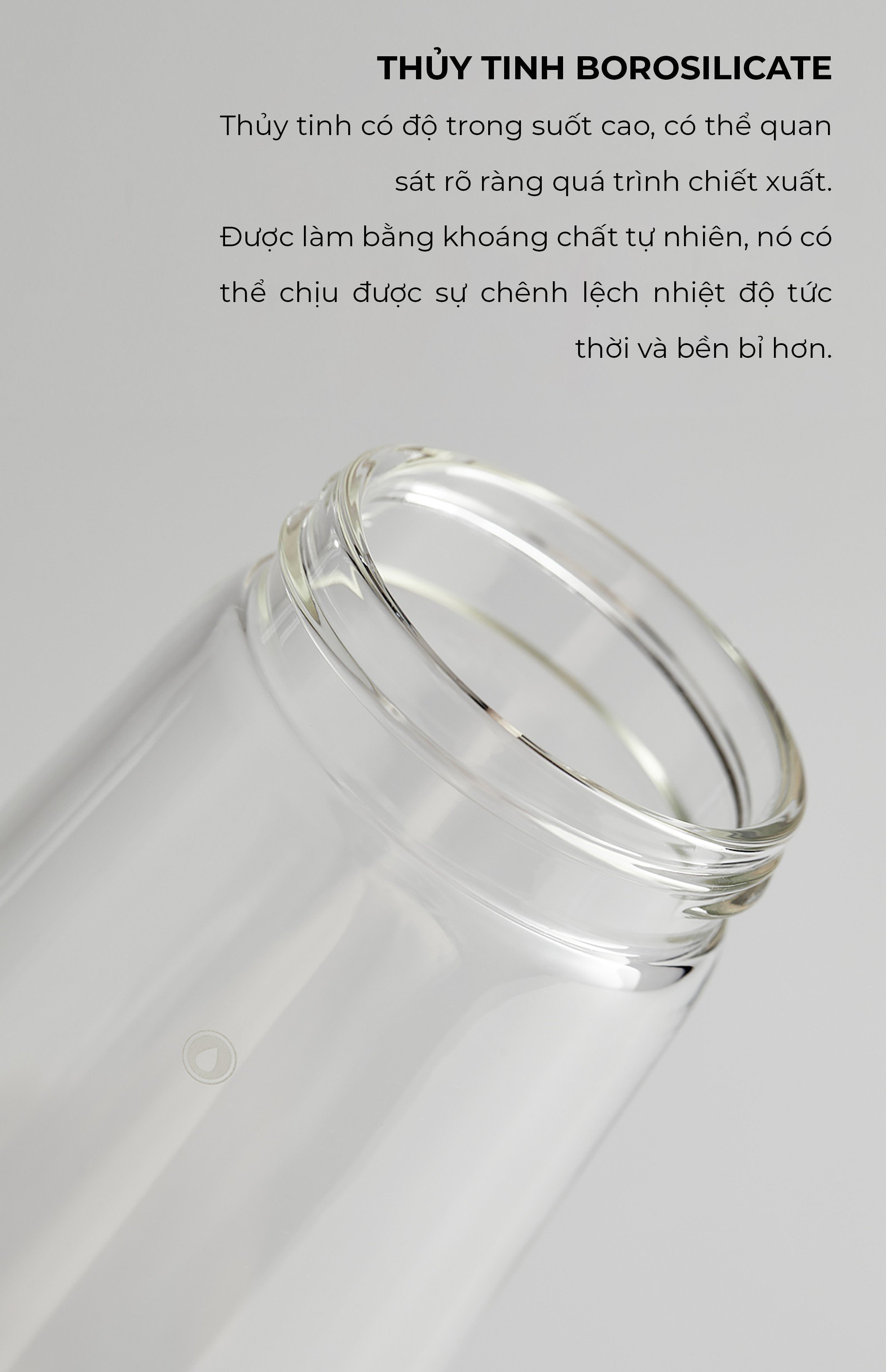 ▪ Thủy tinh chịu nhiệt Borosilicate: Chất liệu thủy tinh cao cấp, không bám hóa chất, dễ dàng rửa sạch, khả năng chịu nhiệt tốt.