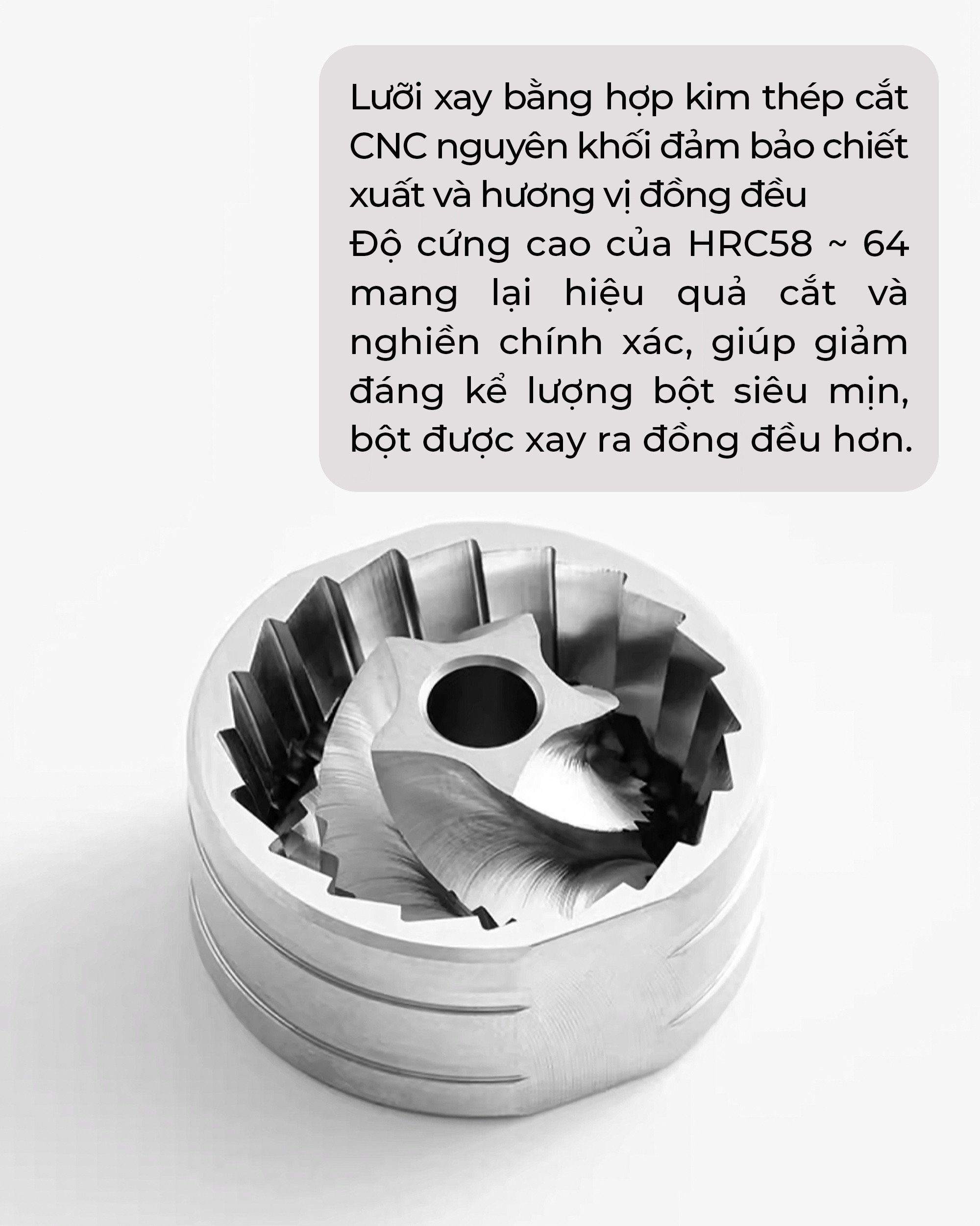 ✅ Trục xay bằng thép cứng ổn định với 2 vòng bi trên dưới: Cho bột cà phê có độ đồng đều đáng ngạc nhiên.