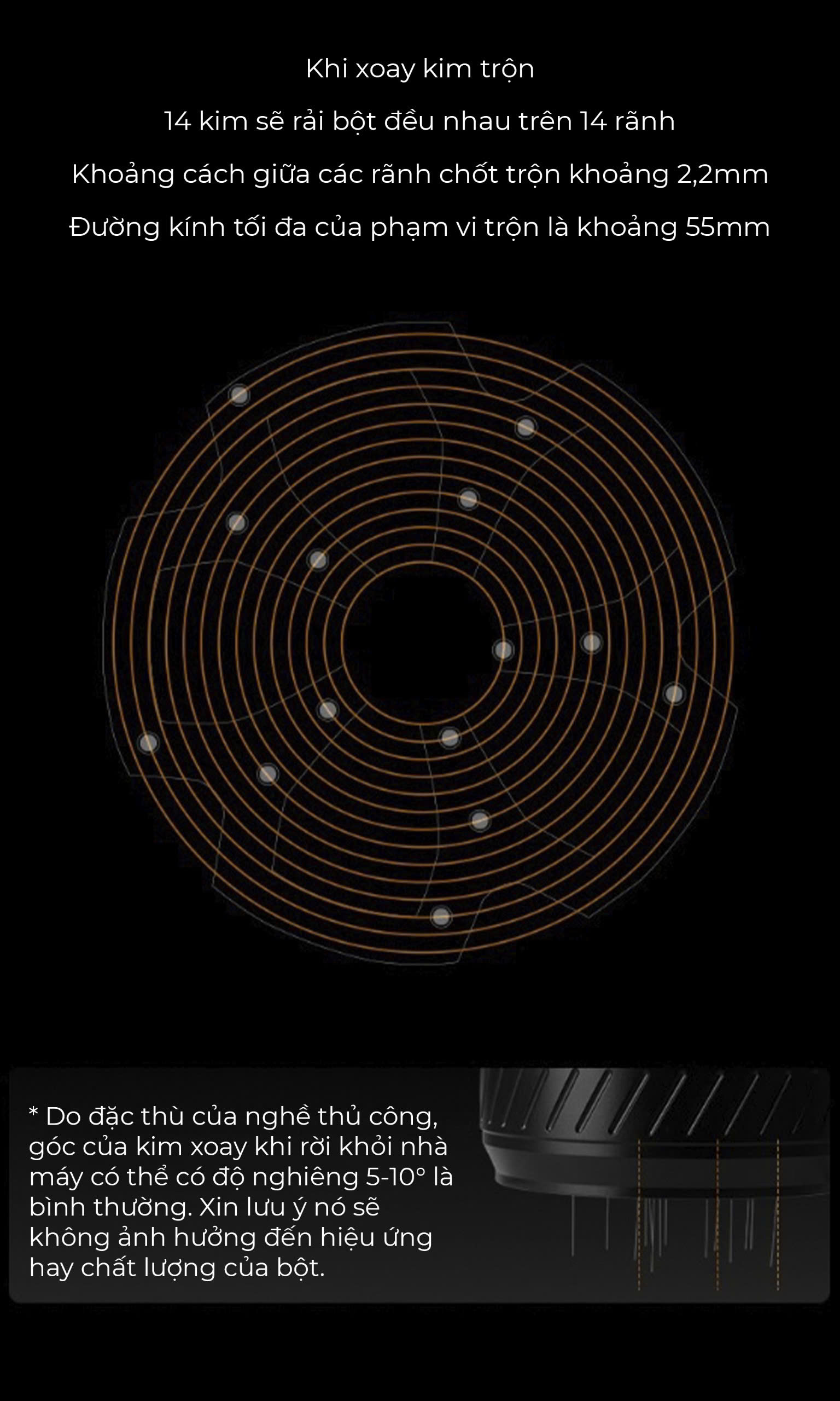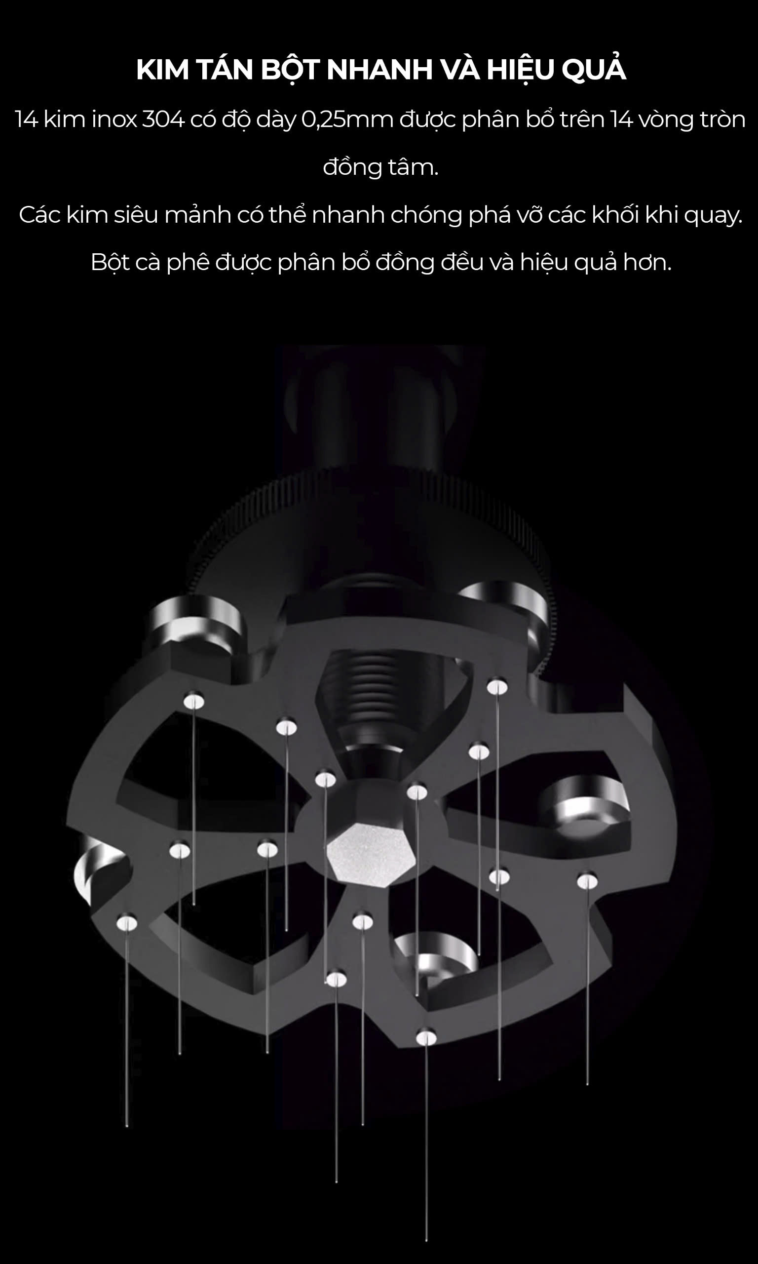 ➡️ Hệ thống 14 kim inox 304 siêu mảnh, dày 0,25mm sắp xếp theo 14 vòng tròn đồng tâm, giúp phân bổ bột tối ưu, hạn chế kênh rãnh (channeling).
