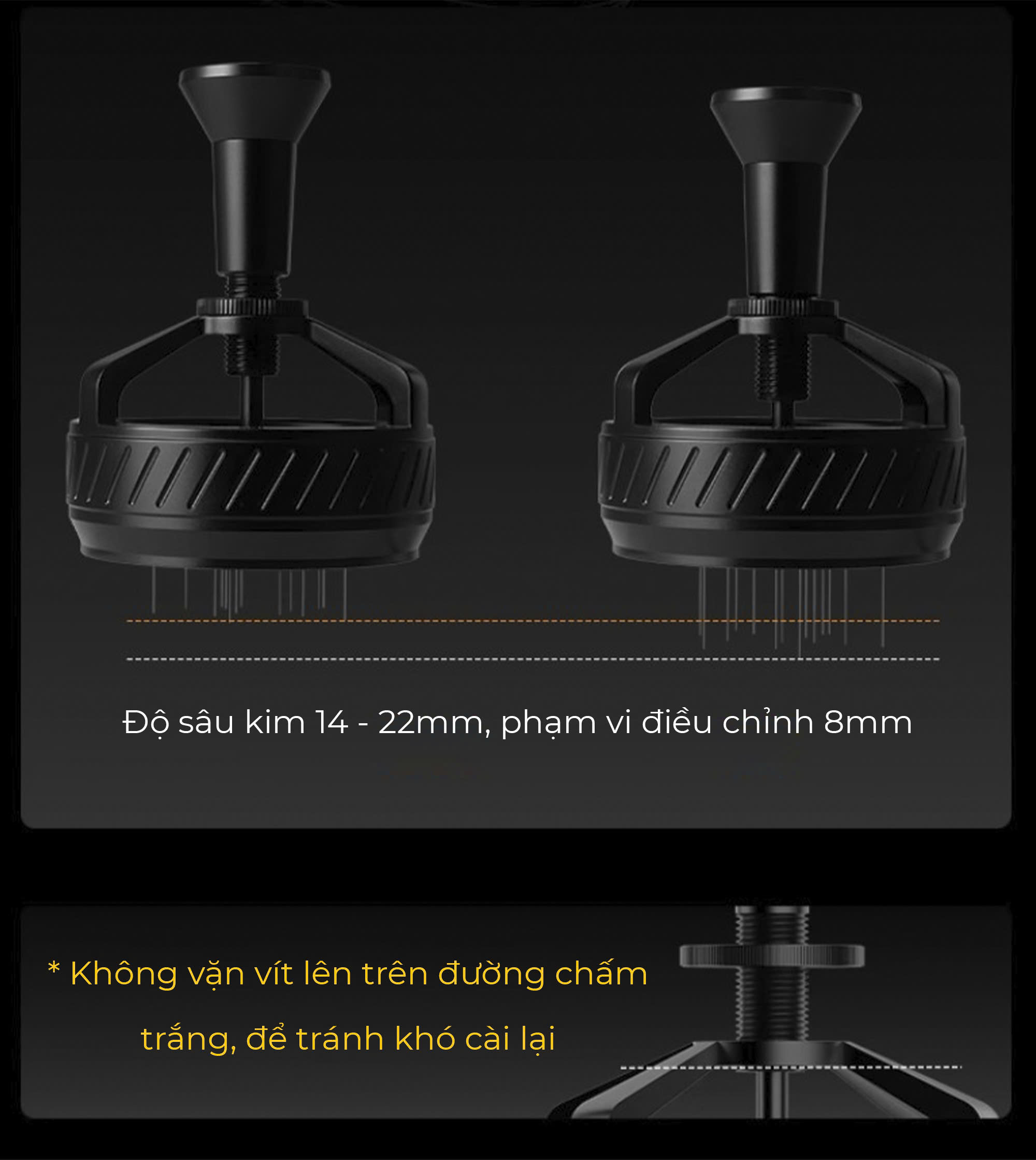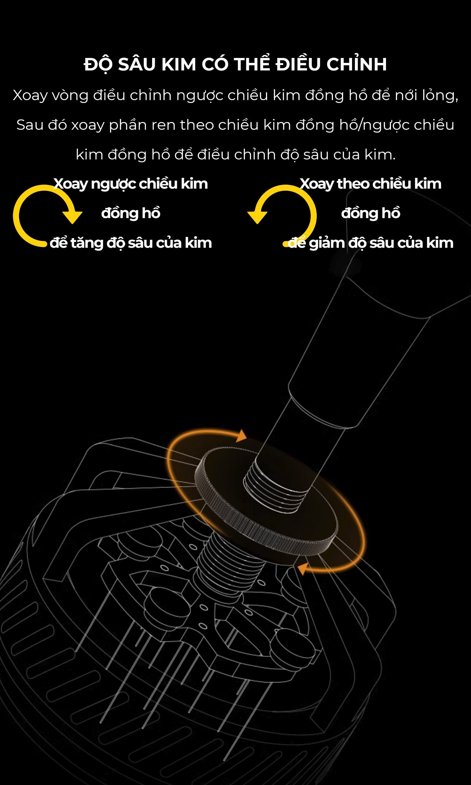 ➡️ Điều chỉnh độ sâu kim linh hoạt (18 - 22mm). Xoay ngược chiều kim đồng hồ để tăng độ sâu, xoay cùng chiều để giảm.