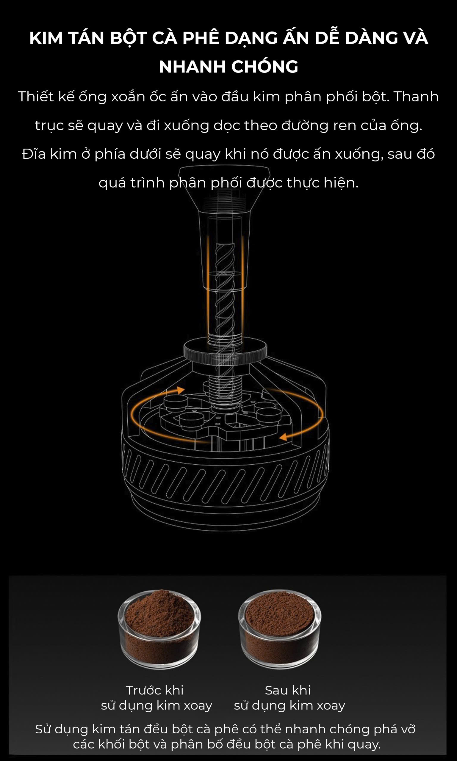 🔥 Feepie Kim Xoay Tán Đều Bột THOR với cơ chế xoắn ốc tự động xoay, giúp phá vỡ các khối bột, làm tơi và trải bột đồng đều trước khi nén, tối ưu hóa hương vị espresso!