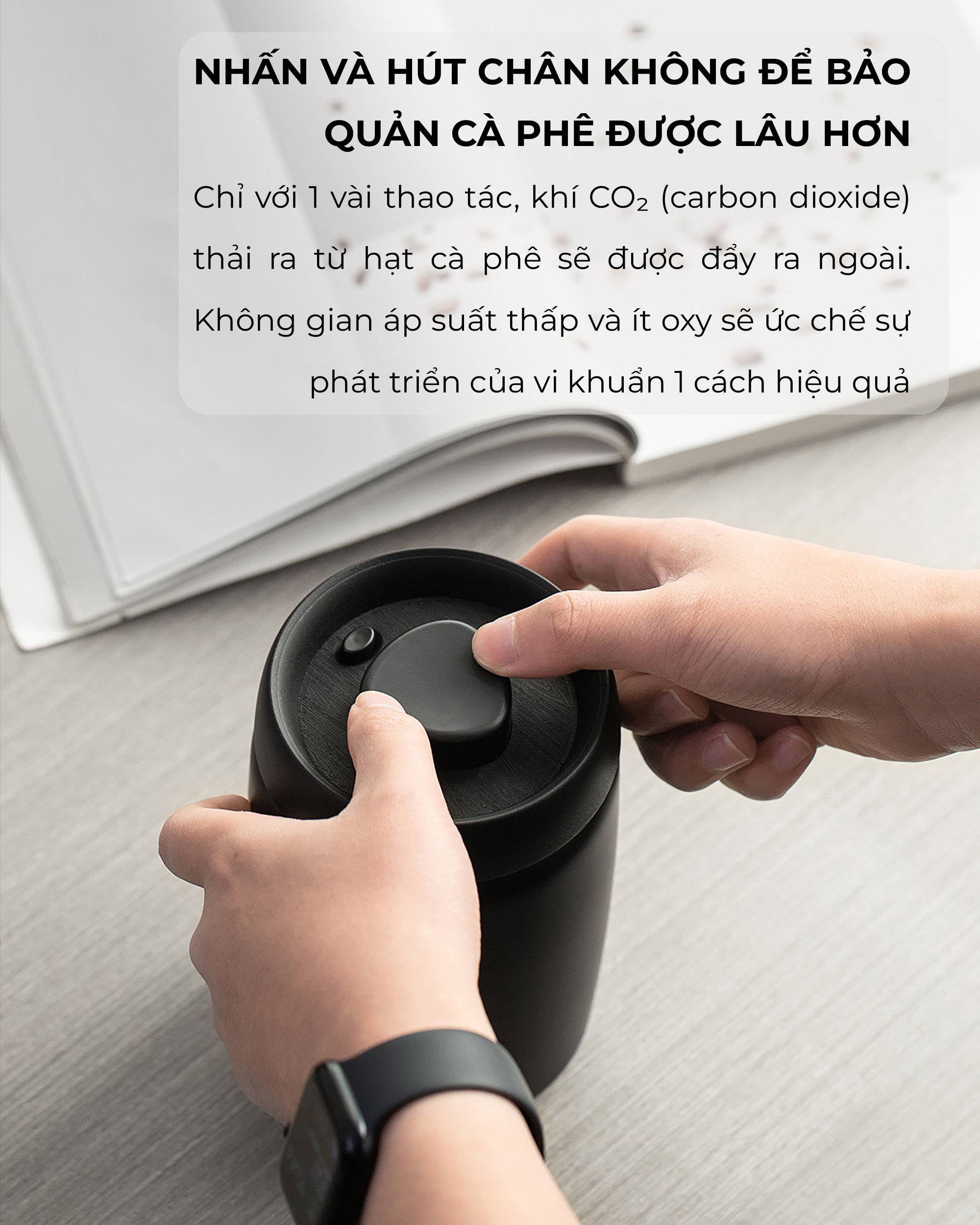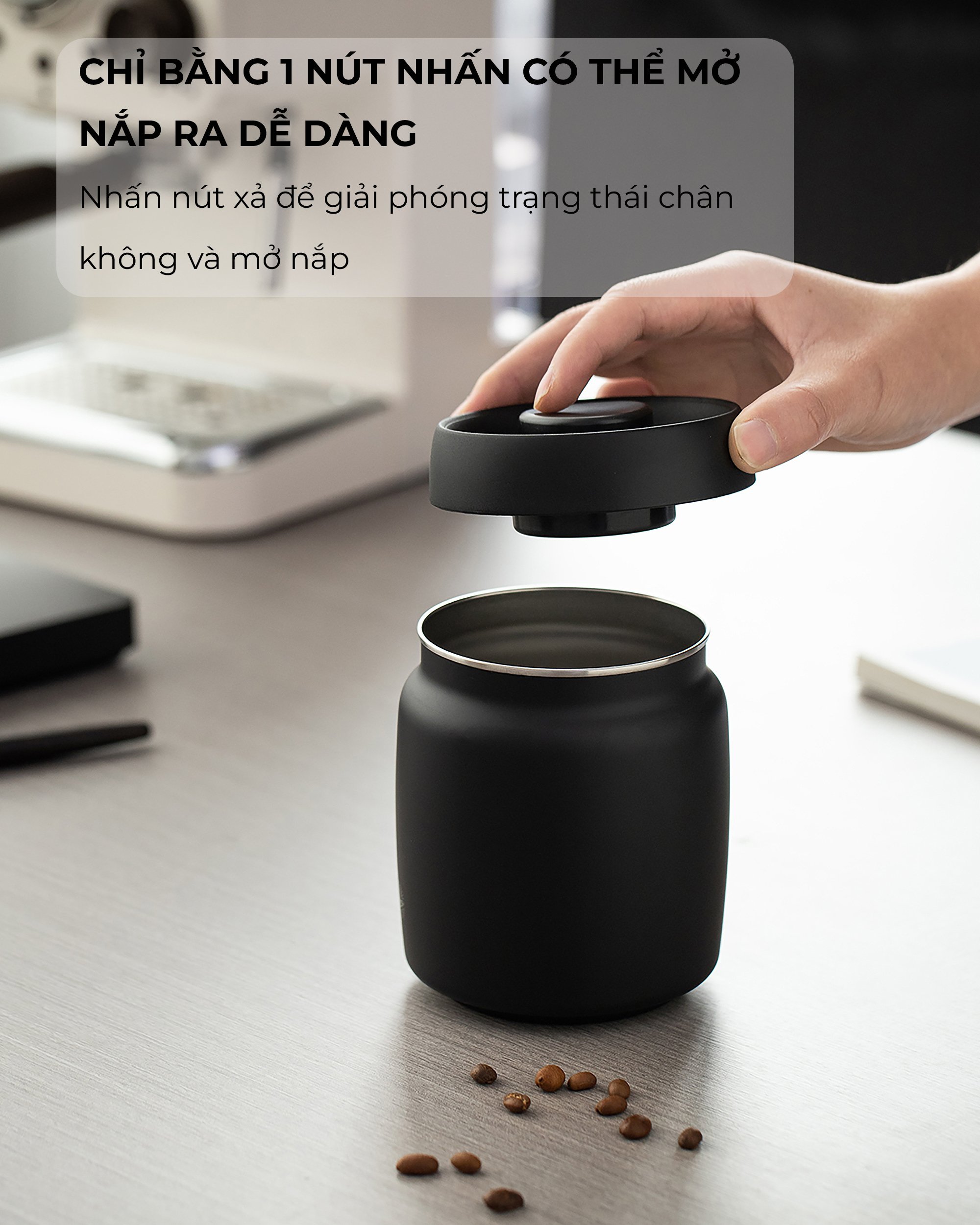 ✅Bơm không khí từ bên trong ra ngoài: Ấn nút lớn ở trên nắp hũ để mở van cho không khí vào. Lúc này áp suất bên ngoài và bên trong được cân bằng, bạn mới có thể mở được hũ để lấy cà phê ra.