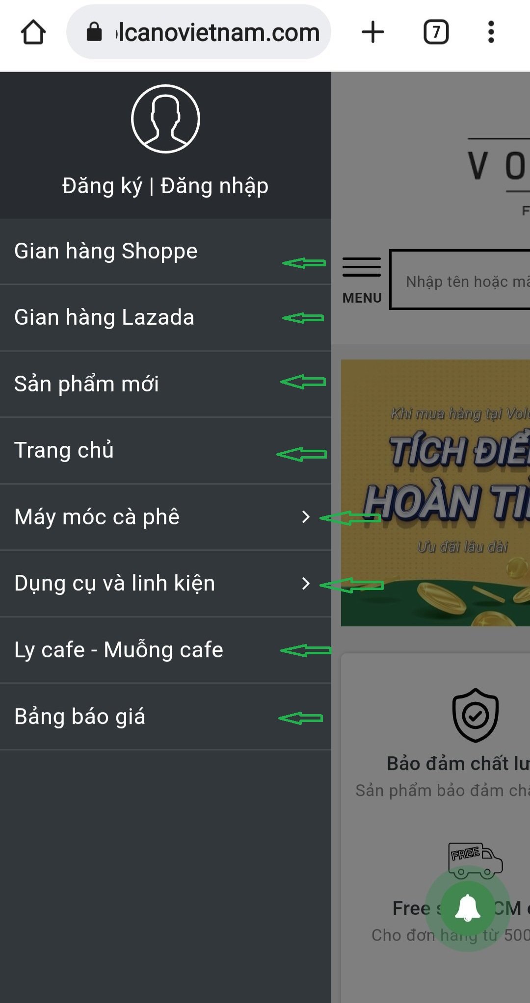 Bấm Menu để ĐĂNG KÝ hoặc ĐĂNG NHẬP nếu đã có tài khoản để nhận được nhiều ưu đãi dành cho thành viên của Volcano Coffee nhé!