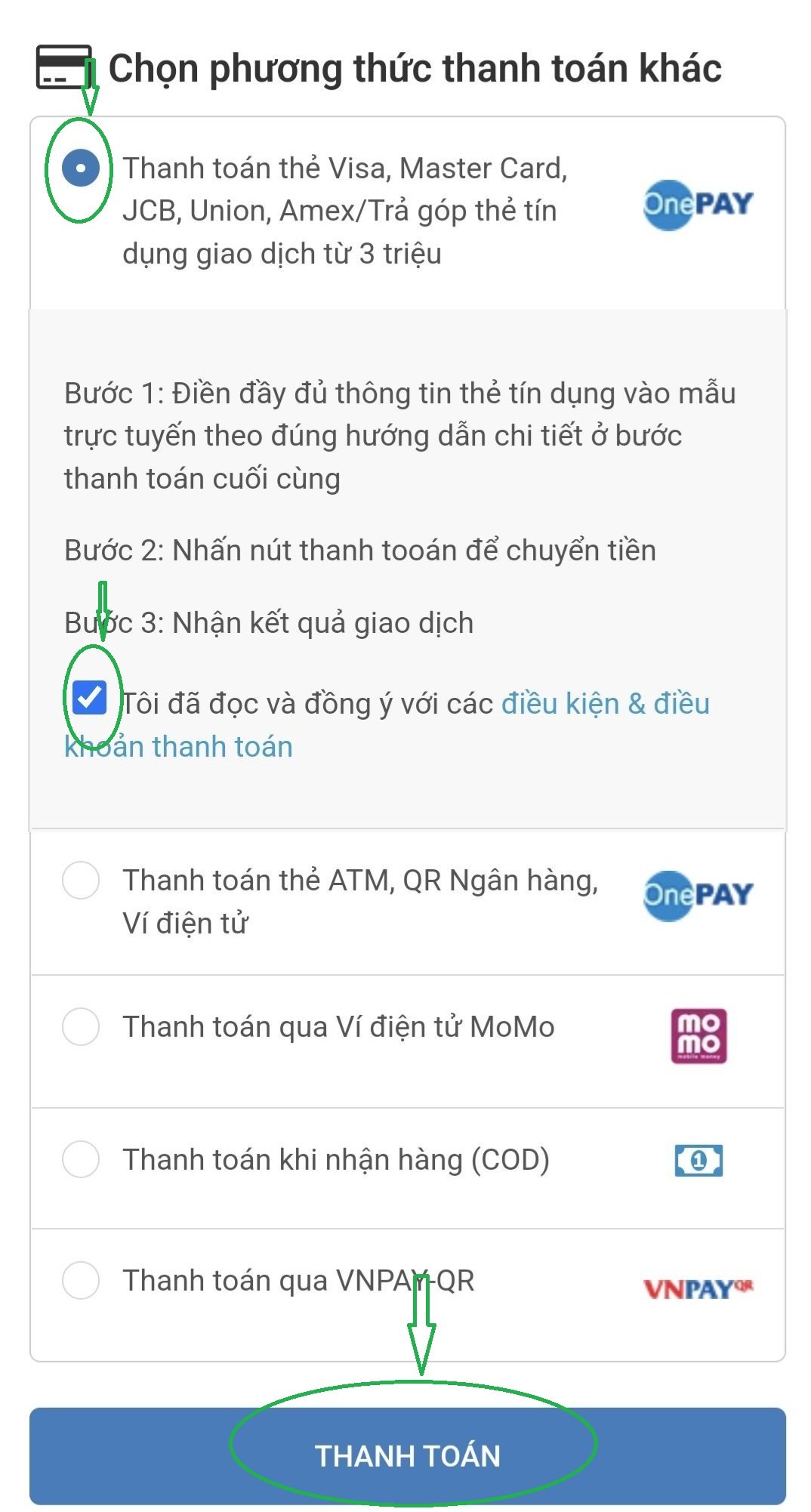 - Bước 3: Bấm THANH TOÁN (với đơn hàng từ 3 triệu, bạn có thể chọn phương thức trả góp qua ONE PAY)