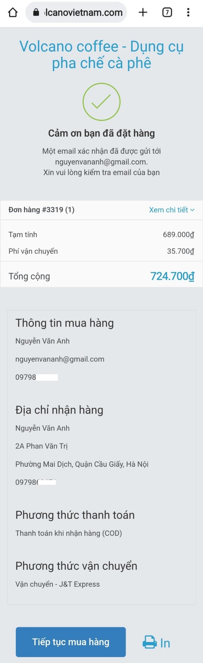 - Email xác nhận đơn hàng sẽ được gửi tới bạn.