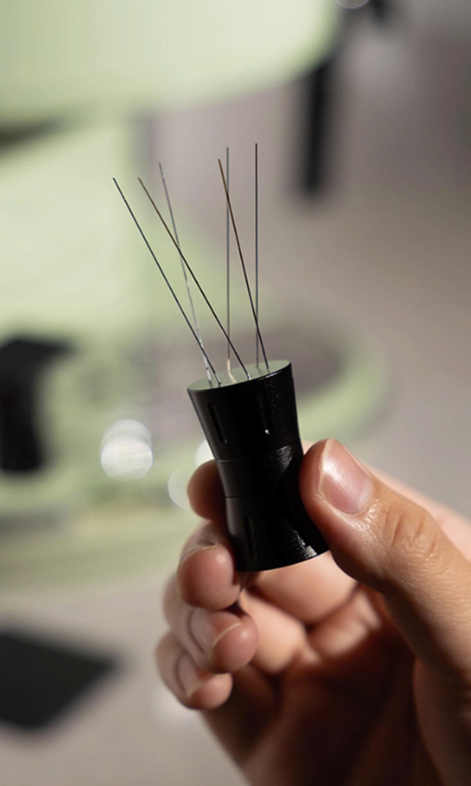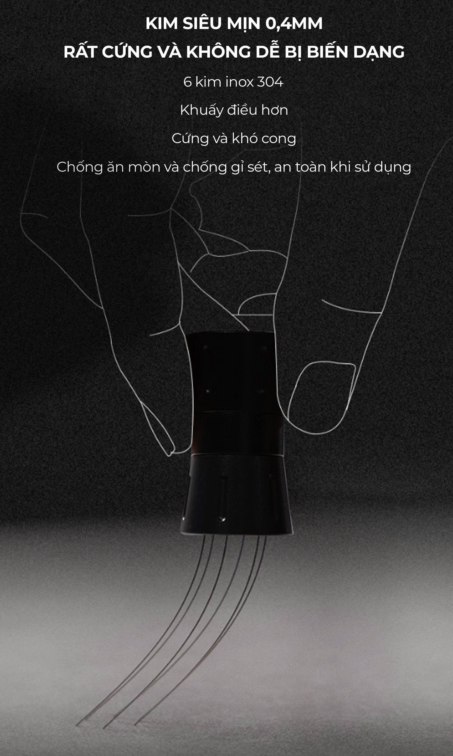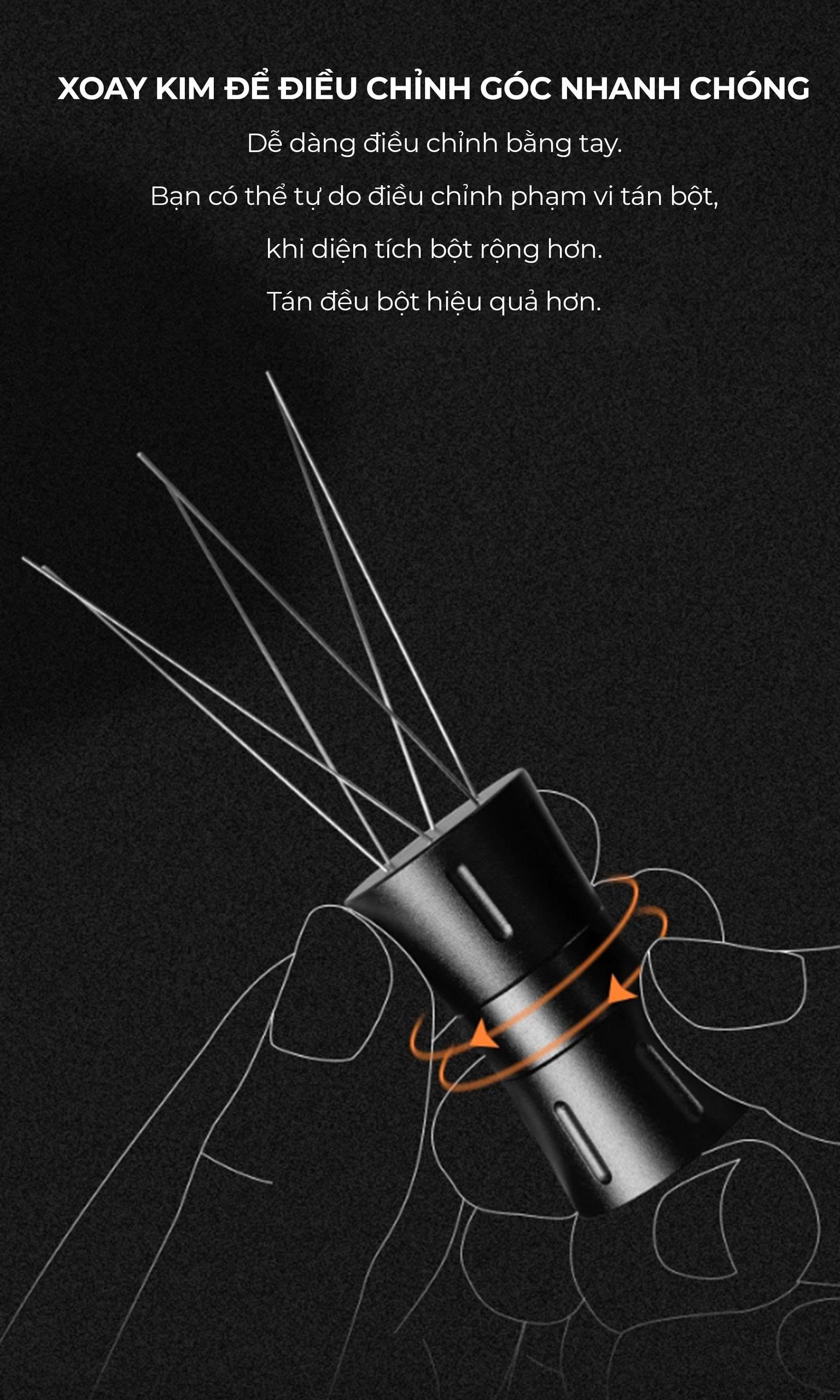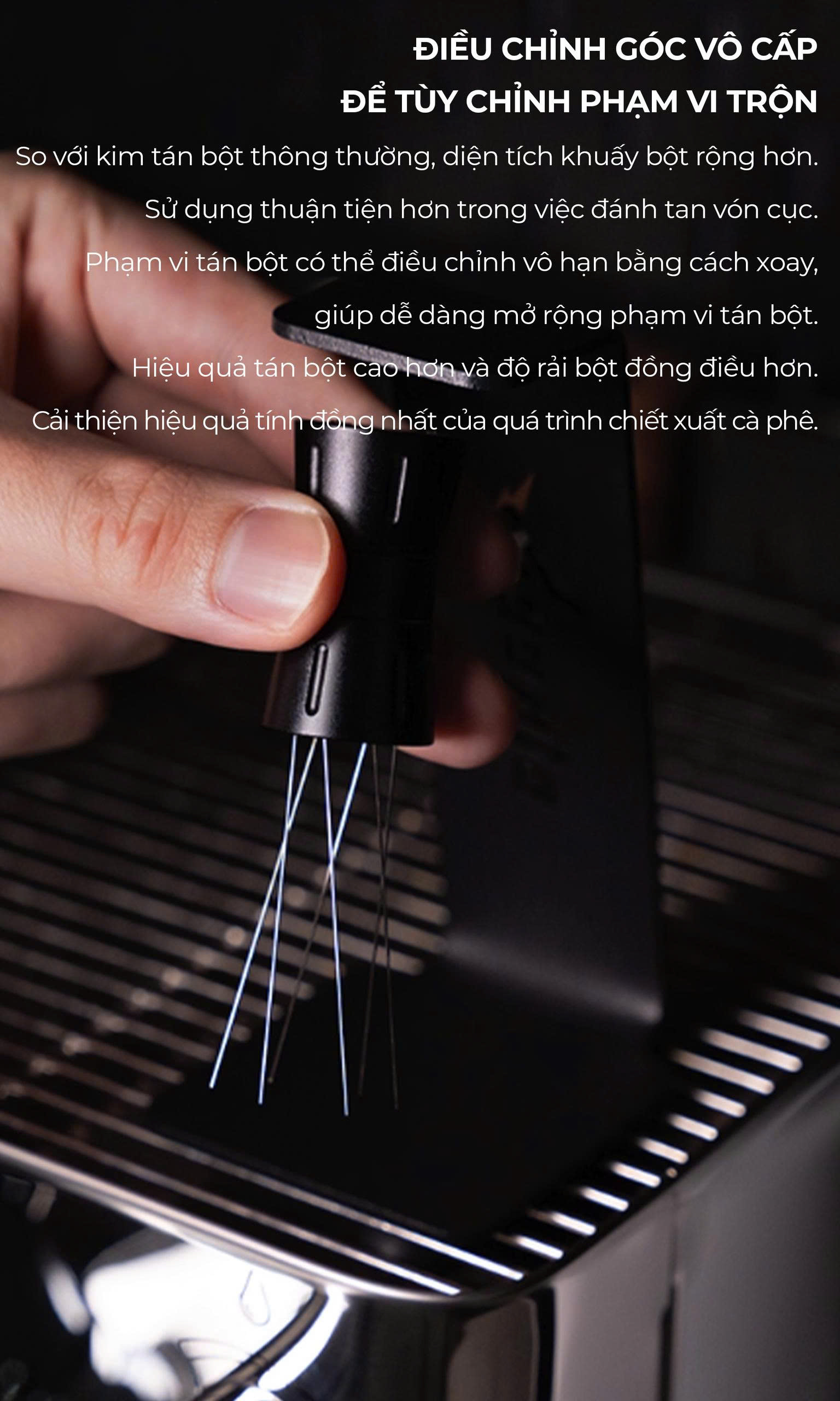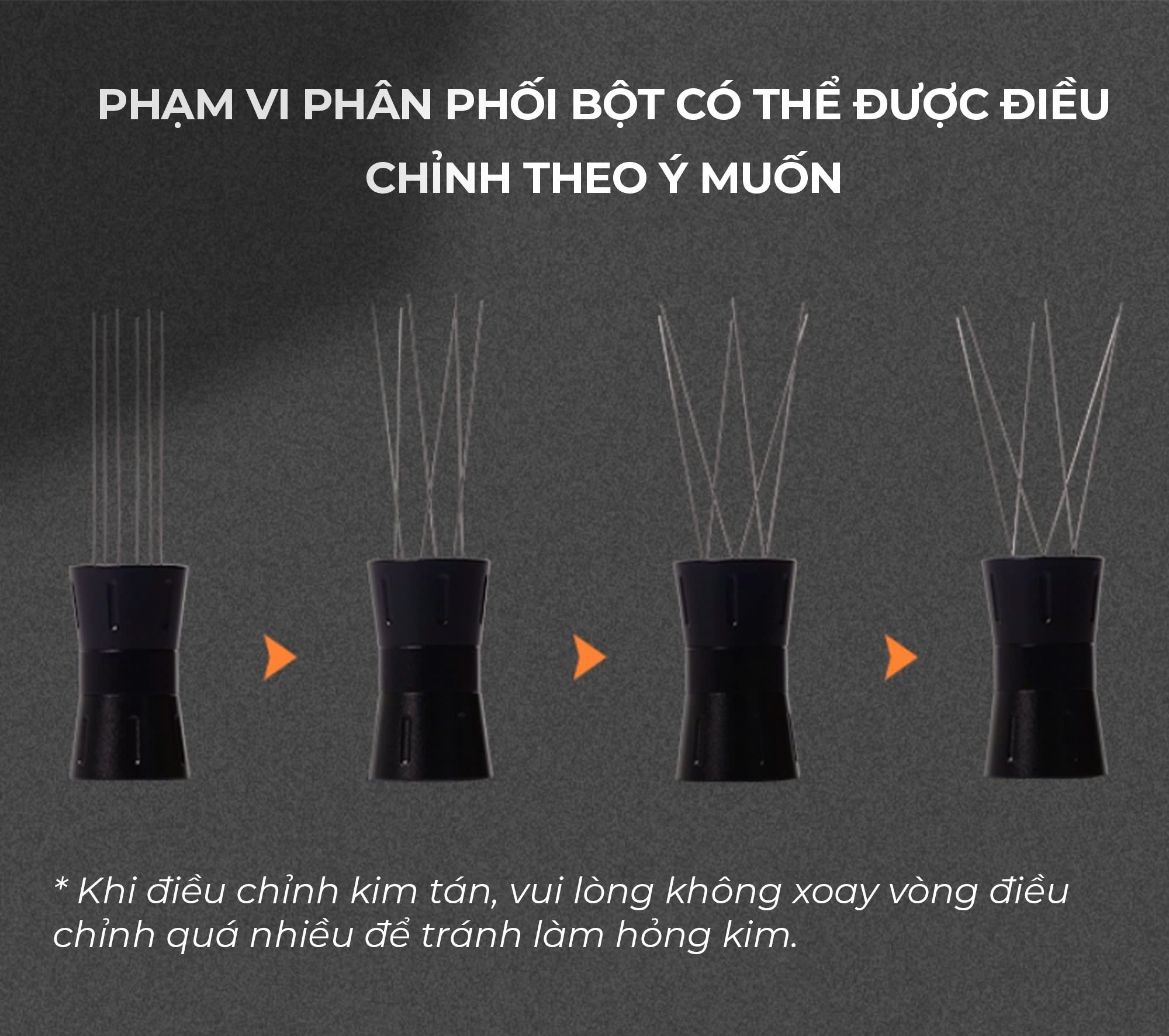 🔹Thiết kế kim siêu mảnh bằng thép không gỉ → phá vỡ mọi cục vón, phân bổ bột đồng đều.