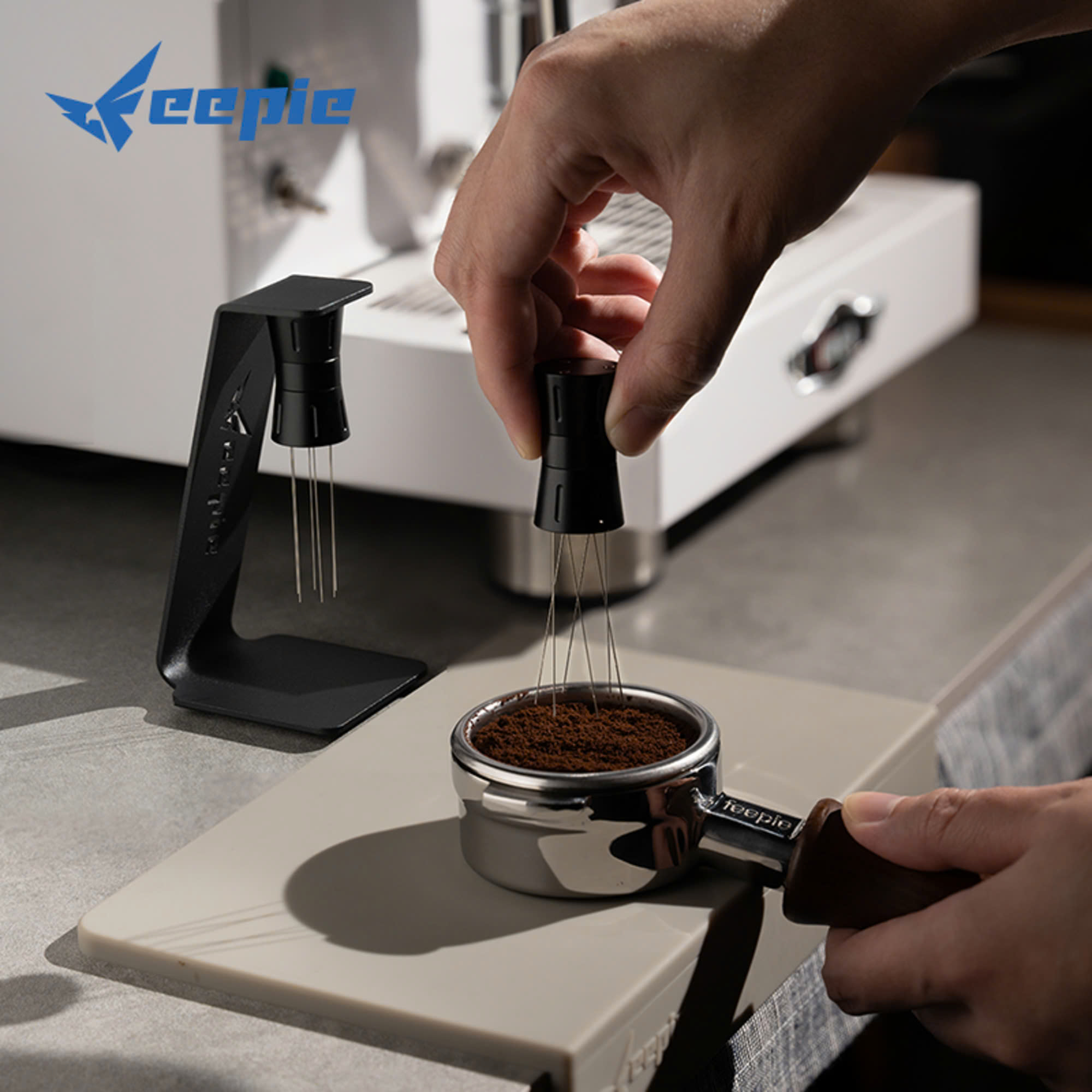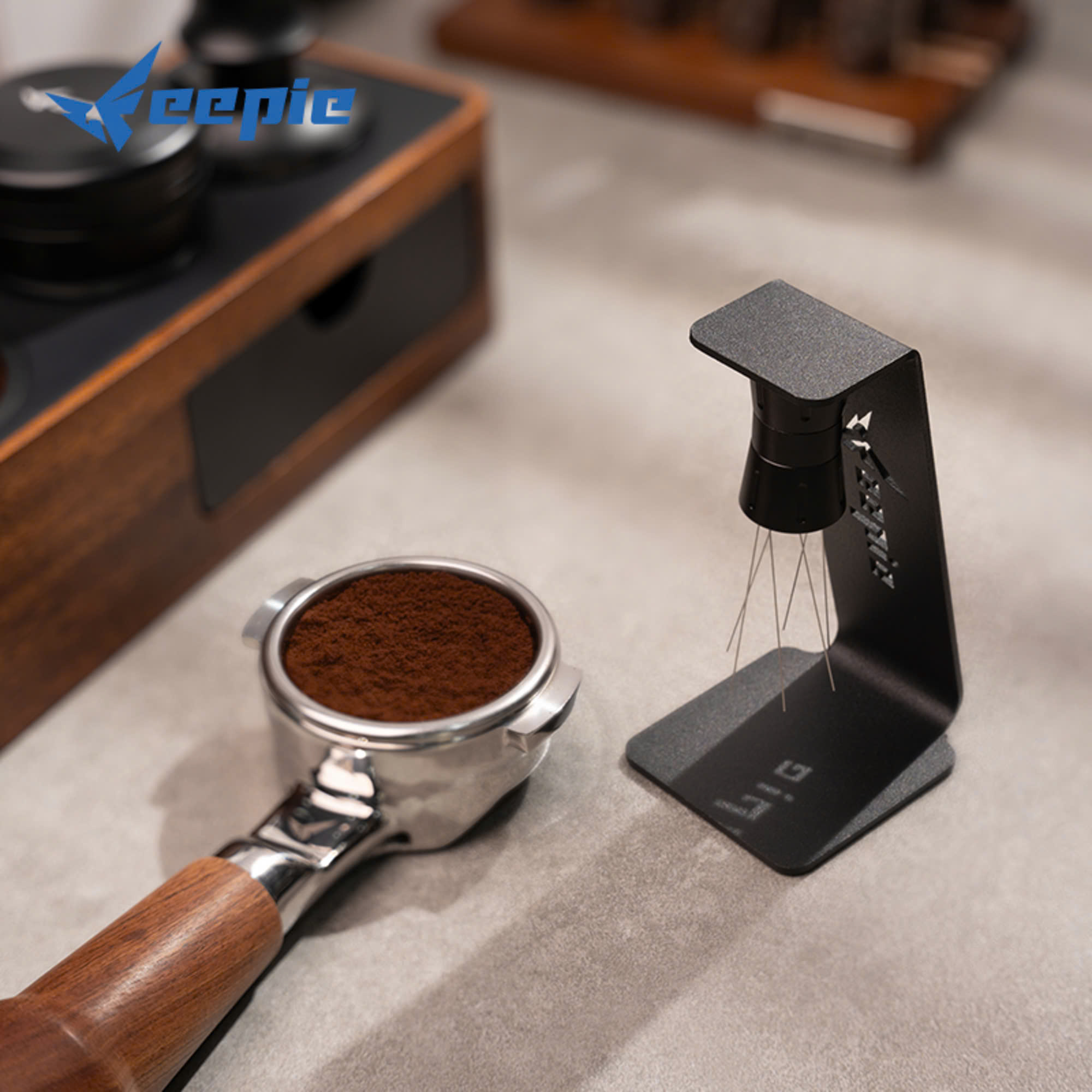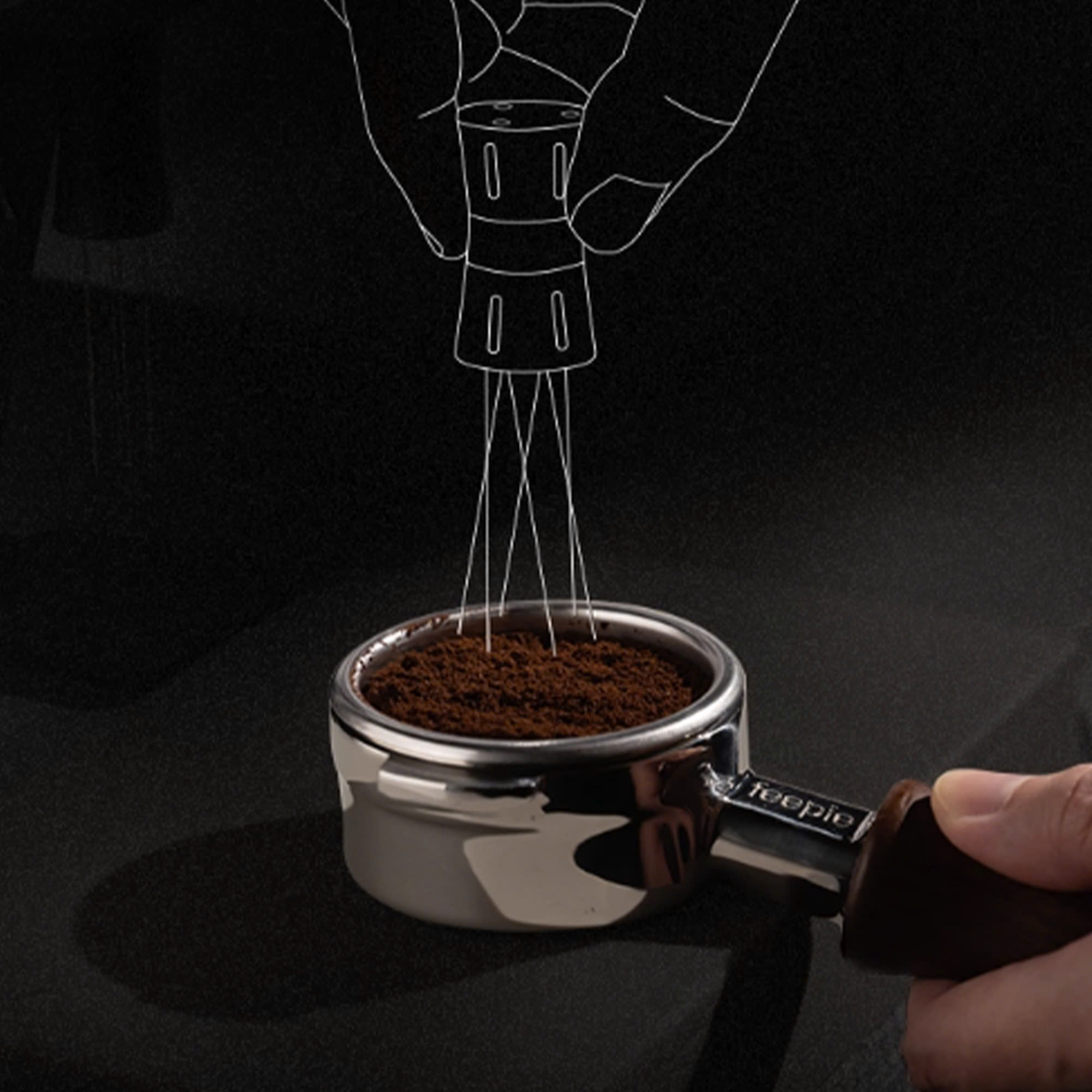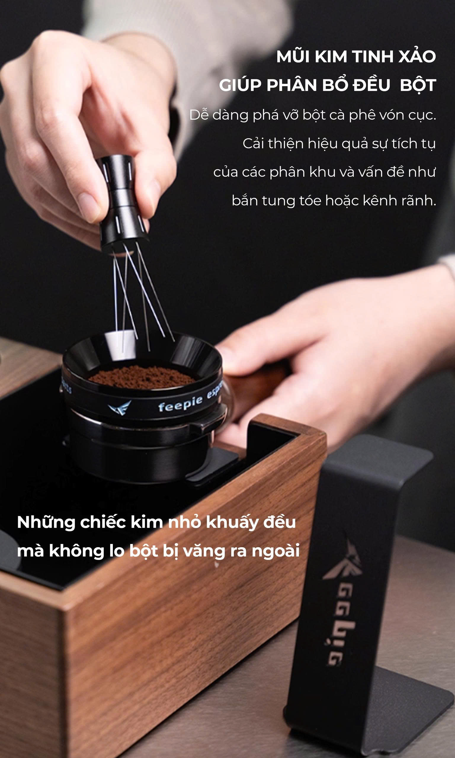 ✅ Giải pháp: Kim tán bột cà phê thông minh FEEPIE – giúp phân tán bột đồng đều, tạo bề mặt mịn trước khi nén.