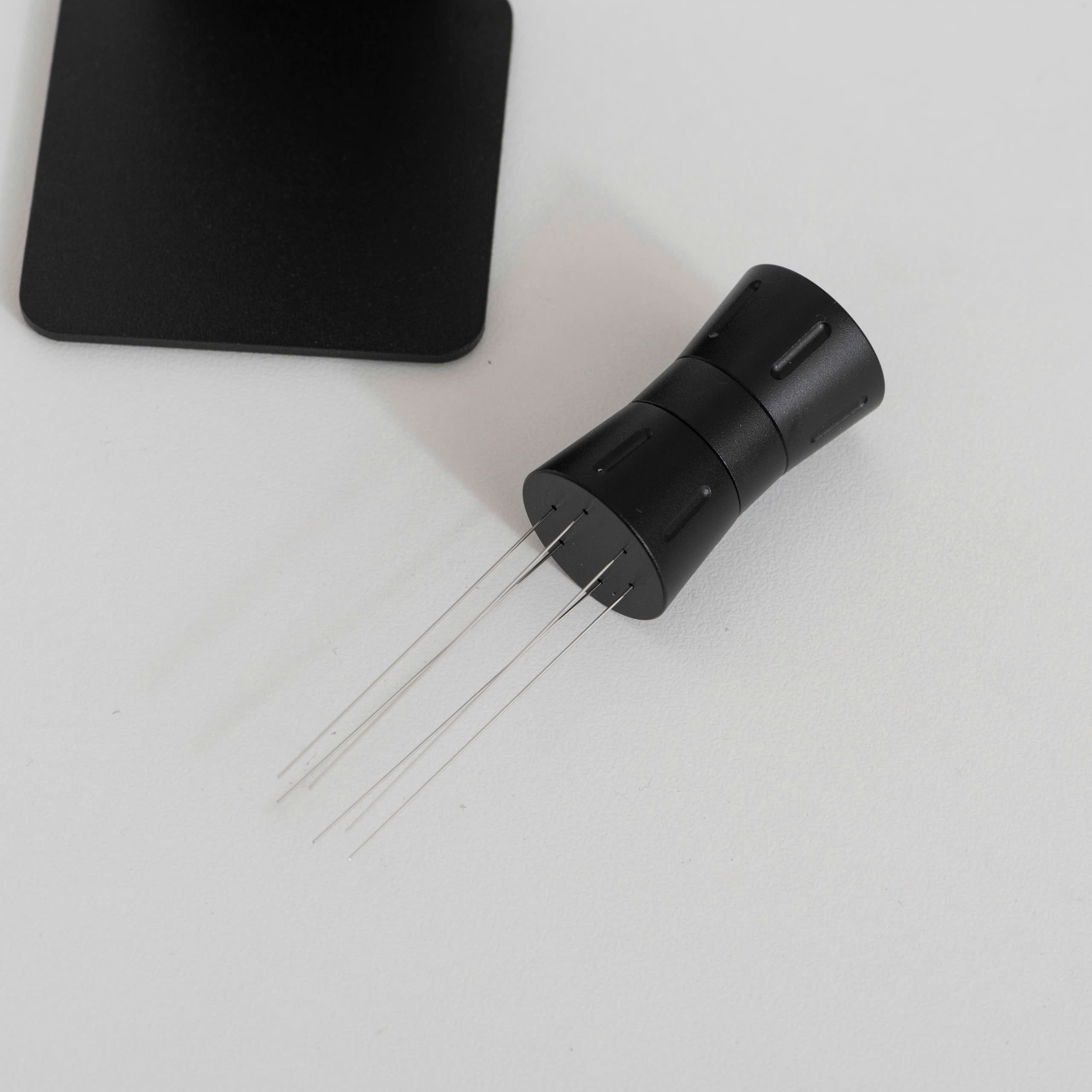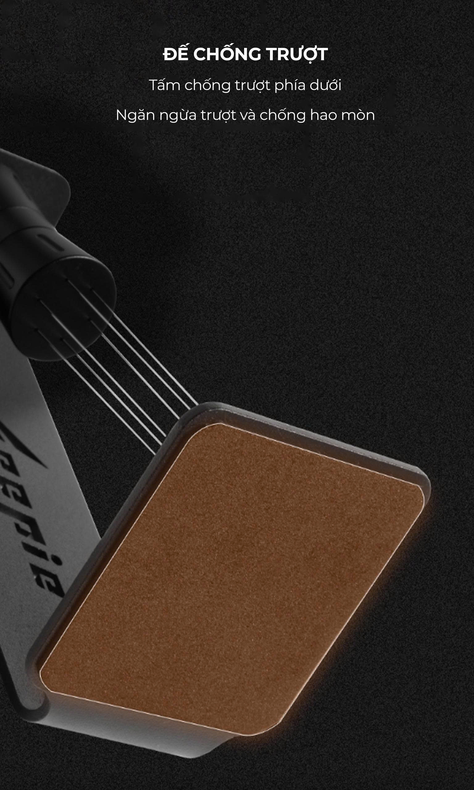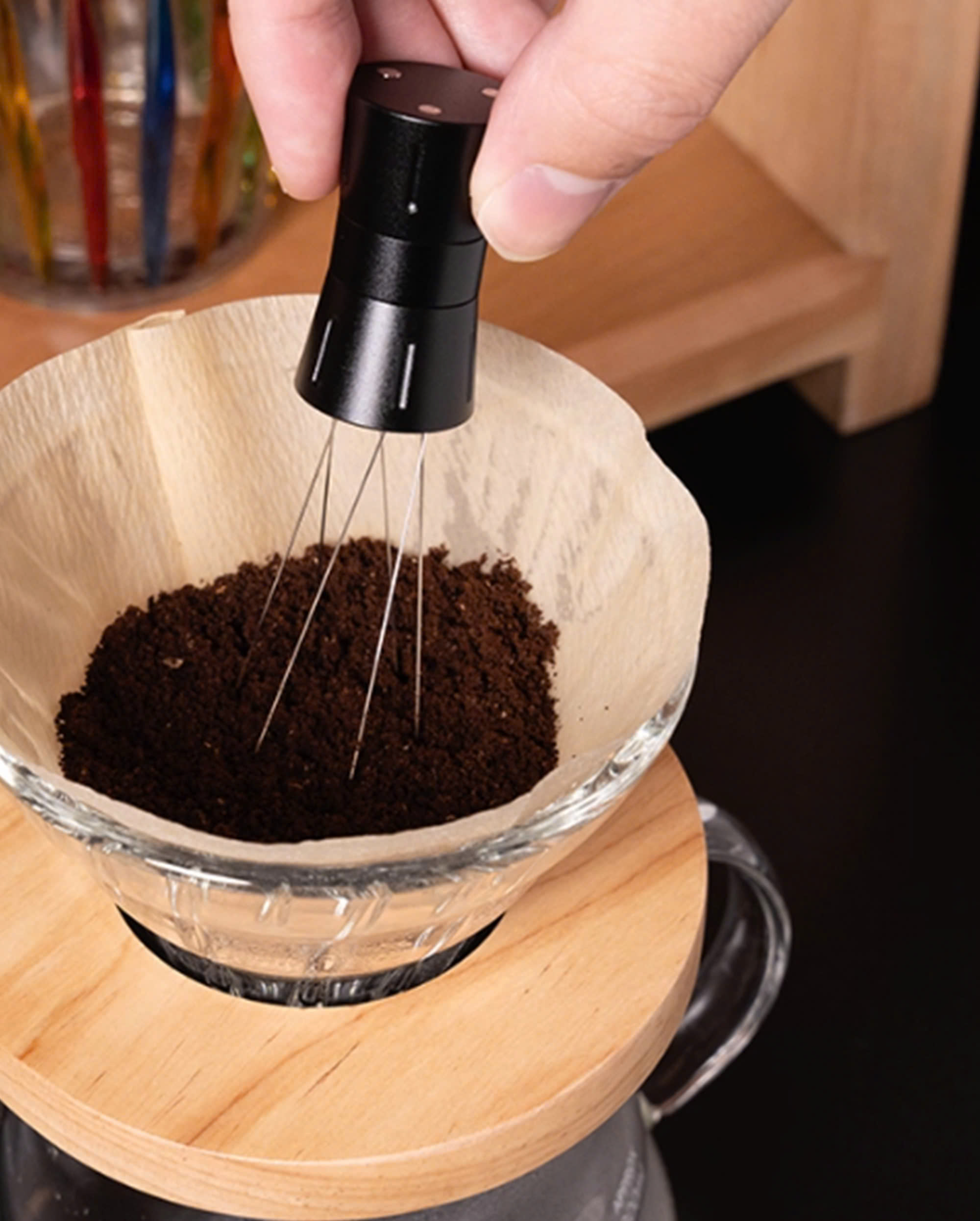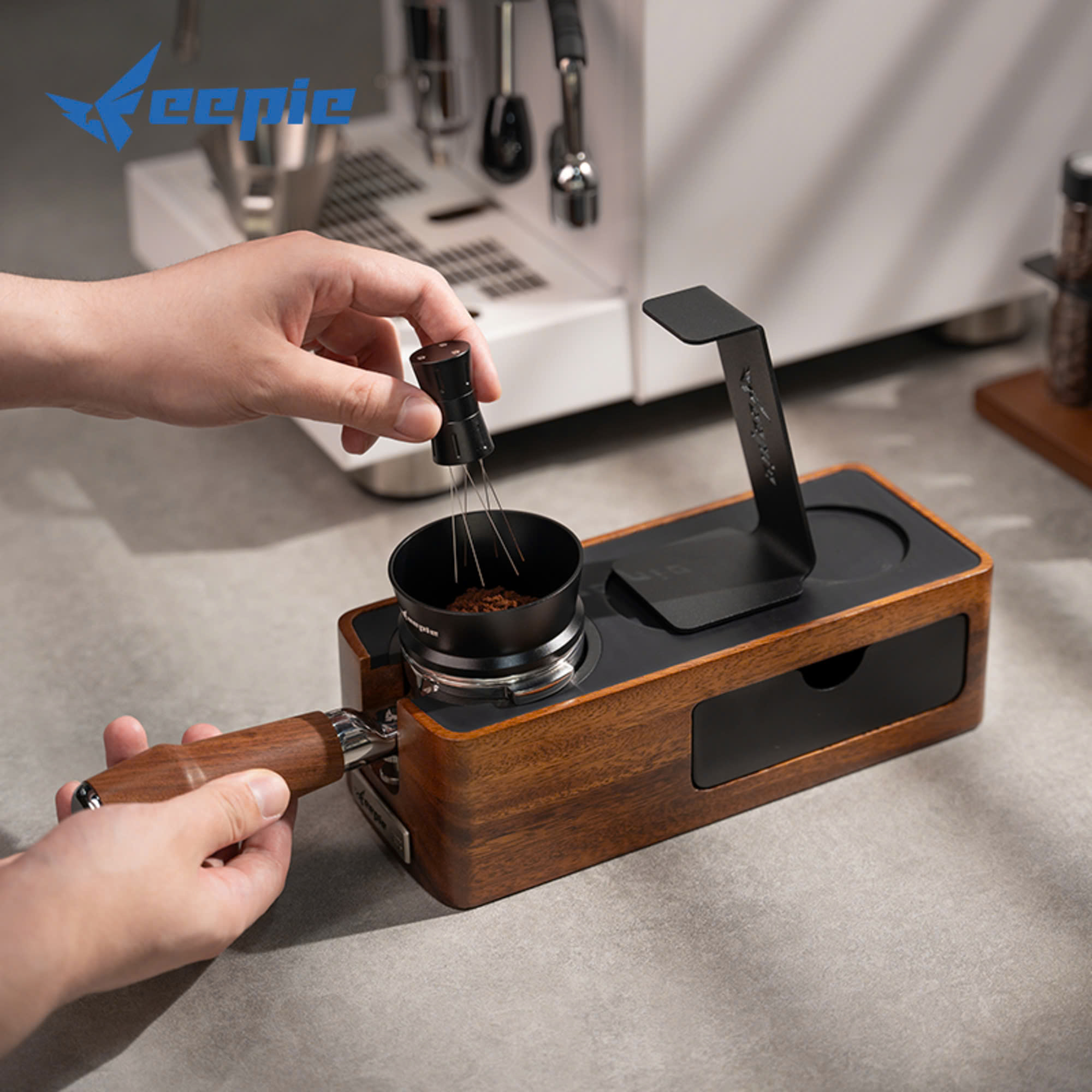 ✅ Giải pháp: Kim tán bột cà phê thông minh FEEPIE – giúp phân tán bột đồng đều, tạo bề mặt mịn trước khi nén.