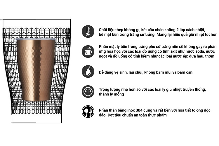 ✅Thân ly được sản xuất hoàn toàn từ thép không rỉ 304 chất lượng cao, vật liệu bền và không rỉ sét. Cấu tạo thân ly gồm: Inox 304 - lớp chân không - Inox 304 phủ men sứ