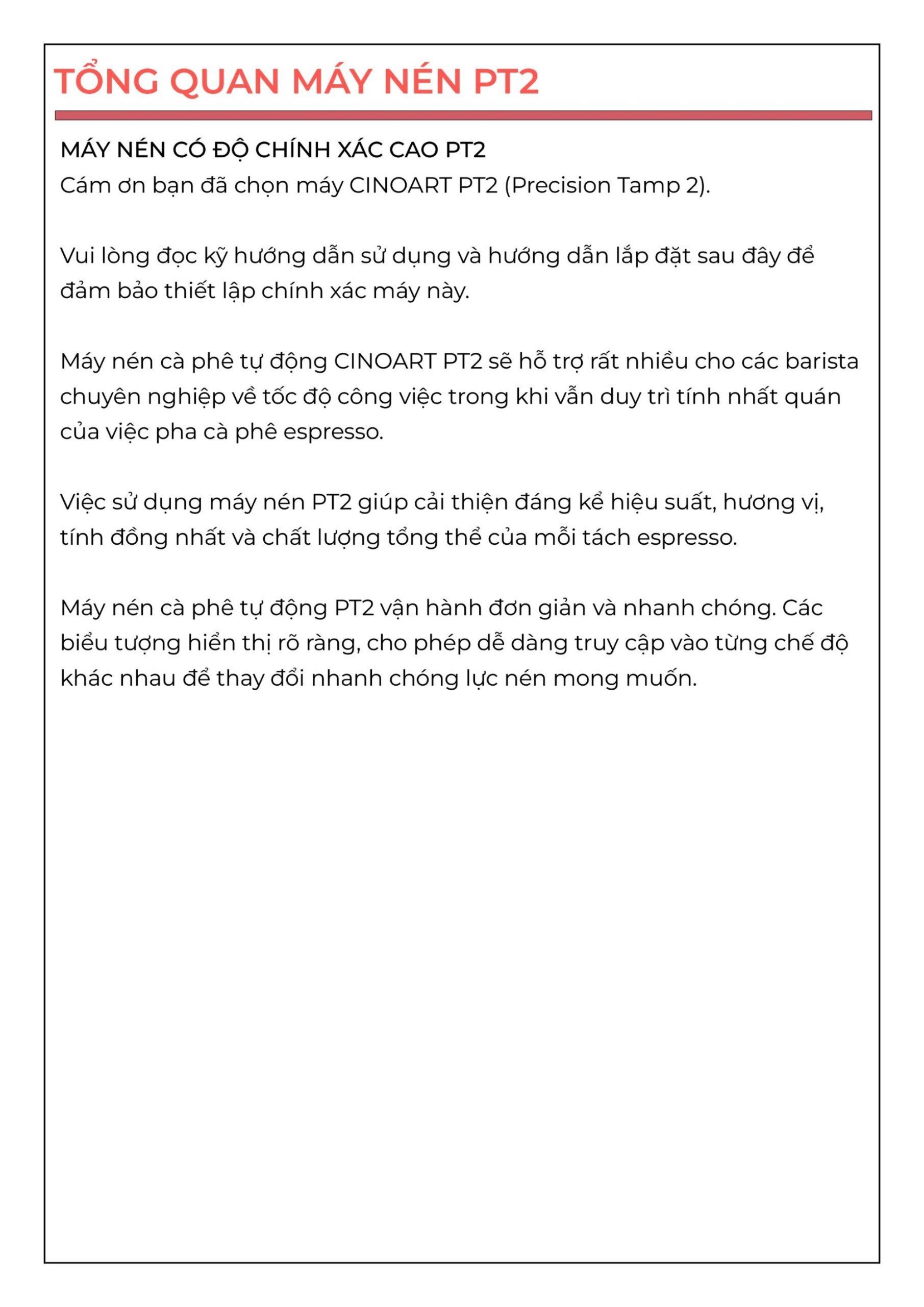 ✅ Lực nén đồng đều và liên tục: Máy nén tự động CINOART PT2 đảm bảo lực nén được thực hiện một cách đồng đều và liên tục, tạo ra một lớp cà phê đồng đều và chất lượng.